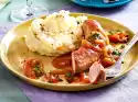 Peel, wash and cut the potatoes into pieces. Cook in boiling salted water for about 20 minutes. Cut the bacon into strips and leave them crispy in a pan without fat. Take out and drain on kitchen paper.