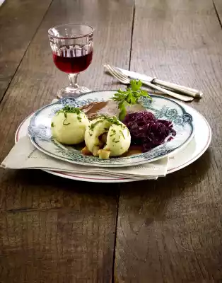 Shape the dough into dumplings and fill each with a few bread cubes. Put the dumplings in lightly boiling salted water, bring to the boil briefly and let them simmer in boiling water for about 25 minutes