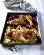 Onions peel and quarter. Lift meat out of the marinade and dab dry with kitchen paper. Pour the stock through a sieve and collect. Season meat with salt and pepper. Heat the oil in a roasting pan and fry the meat thoroughly, turning it over. Add soup vegetables and onions and fry briefly while turning. Deglaze with the stock and season well with salt, pepper and a little sugar. Cover and braise in a preheated oven (electric cooker: 175 °C/ convection oven: 150 °C/ gas: level 2) for about 2 1/2 hours. Turn roast occasionally