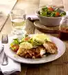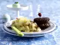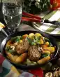 Cut the potatoes into slices. Wash the pears, quarter them, remove the seeds and cut them into slices. Layer both with the medallions in a greased casserole dish. Spread sauce over them. Bake in the preheated oven (electric cooker: 200 °C/ convection oven: 175 °C/gas: level 3) for about 20 minutes. Garnish with remaining marjoram