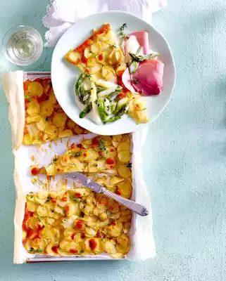 Add the asparagus to the sauce and heat up again. Wash the thyme, shake dry, pluck leaves from the stalks. Remove potatoes from the oven. Sprinkle with thyme and cut into very large cake pieces. Arrange a piece of cake, some asparagus in sauce and cottage ham on plates.