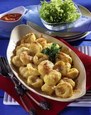 Cut off approx. 2 cm wide slices. Dust hands with starch and form gnocchi (16-18 g). Press in the gnocchi with a fork and cook in portions in boiling salted water for about 10 minutes. In the meantime grate parmesan. Remove the gnocchi and layer them in an ovenproof dish. Sprinkle some Parmesan cheese on top. Cook all the gnocchi bit by bit, layer them and sprinkle with parmesan. Sprinkle the gnocchi with breadcrumbs, sprinkle with the remaining olive oil and bake in a preheated oven (electric range: 225 °C/ gas: level 4) for 10-15 minutes. In the meantime season tomato sauce with salt and pepper and stir in the remaining parsley. Serve gnocchi garnished with the remaining parsley and thyme. Serve tomato sauce separately. Serve with a green salad