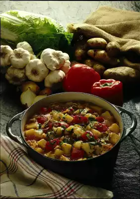 Peel, wash and dice the potatoes bite-sized. Peel onions and cut into slices. Peppers clean, wash and cut into larger cubes. Heat oil in a pot. Fry potatoes, onions and bell peppers. Peel garlic, press through the garlic press and add. Season with salt and pepper.