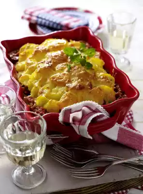 Cut the potatoes into slices. Put the minced meat in a casserole dish. Spread potato slices on top. Pour cream over them. Sprinkle with cheese and bake in the preheated oven (electric cooker: 200 °C/ convection oven: 175 °C/ gas: level 3) for about 25 minutes. Garnish with marjoram