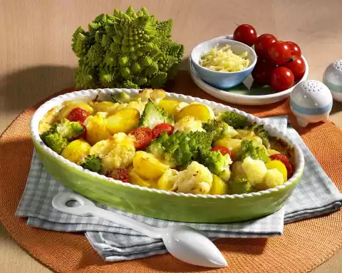 Stir in stock and milk and bring to the boil while stirring. Let simmer for about 10 minutes. Remove from heat and stir in cheese. Season with salt and cayenne pepper. Put potatoes, romanesco, cauliflower and tomatoes into an ovenproof casserole dish.