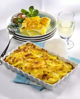 Lightly grease a casserole dish. Spread potatoes and milk in it, season. Pour cream balance over it and sprinkle with cheese. Bake in a preheated oven (electric cooker: 200 °C/ convection oven: 175 °C/gas: level 3) for 40-45 minutes