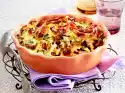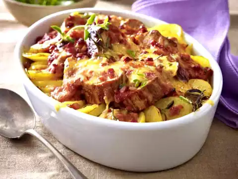 Cut the meat open. Distribute in the middle of the casserole. Pour tomato cream over it. Sprinkle with rosemary, cheese and rest of bacon. Bake in the preheated oven (electric cooker: 200 °C/circulating air: 175 °C/gas: level 3) for 20-25 minutes.