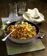 Deglaze with tomatoes, 150 ml water and cream. Bring to the boil, stir in stock and herbs. Season with salt, pepper and paprika and simmer for about 5 minutes.