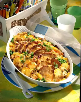 Place the potatoes and chops in a large greased casserole dish. Spread mushrooms, peas and sauce on top. Sprinkle the rest with cheese. Bake in a hot oven (electric cooker: 200 °C/ convection oven: 175 °C / gas: level 3) for 20-25 minutes