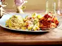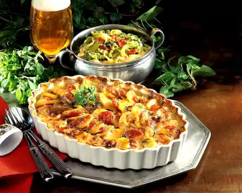 Bake in the preheated oven (electric cooker: 200 °C/ gas: level 3) for about 50 minutes. In the meantime, separate the outer leaves from the savoy cabbage. Halve the savoy cabbage and remove the stalk. Cut the savoy cabbage into fine strips. Peel and finely dice the onion. Dice the bacon as well. Fry the bacon and onion in a pan. Add cabbage and steam. Mix 3 tablespoons cream and 1 tablespoon flour. Mix the rest of the cream, tomato paste and stock, add to the savoy cabbage and bring to the boil. Stir in flour. Season cabbage with cumin, salt and pepper and cook for 15-20 minutes.