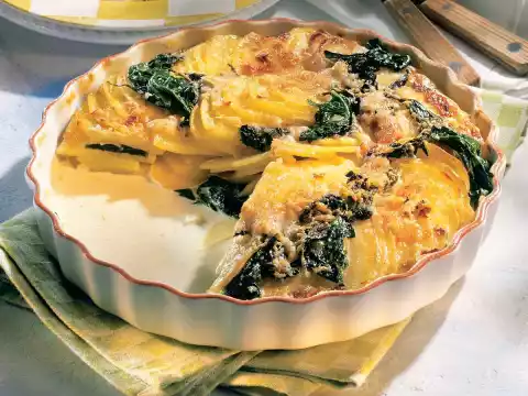 Squeeze out some of the spinach and layer it together with the potatoes in the mould. Pour spiced cream over it and cook in the preheated oven (electric cooker: 200 °C/ gas: level 3) for about 1 hour. Grate the Parmesan finely and spread it over the gratin about 20 minutes before the end of the cooking time and bake it au gratin.