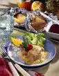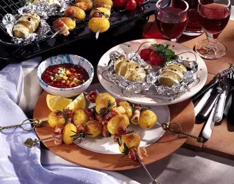 Wash the rosemary, dab dry and pluck into small twigs. Roll up bacon slices and put them on 4 skewers alternating with the small potatoes. Put rosemary in between. Brush the potatoes with oil and season with salt and pepper. Cut out 3-4 wedges from the big potatoes and fill each with some sheep's cheese cream. Put them on some aluminium foil. Grill the skewers and stuffed potatoes on the preheated grill for 10-15 minutes. Turn the skewers in between