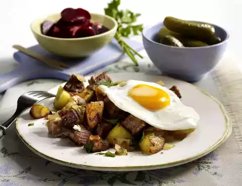 Add the onion 3 minutes before the end of cooking time. Add the meat to the potatoes in the pan and fold in carefully. In the meantime, heat 1/2 tablespoon of clarified butter in a second pan and fry the eggs. Season with salt. Wash parsley, shake dry, pluck leaves from the stalks and chop. Sprinkle parsley on the crumbs. Arrange crumbs and fried eggs on plates. Serve with gherkins and beetroot salad