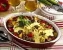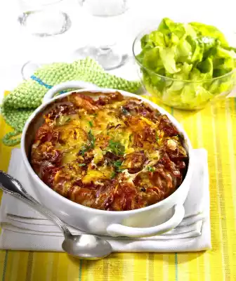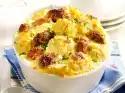 Place overhanging bacon slices on top. Cut 1 slice of cheese into fine strips. Spread it in the middle on the potato mixture. Bake in the preheated oven (electric cooker: 200 °C/ convection oven: 175 °C/ gas: level 3) for 40-45 minutes. Wash parsley and dab dry. Cut leaves into fine strips. Sprinkle over the casserole. Serve with green salad