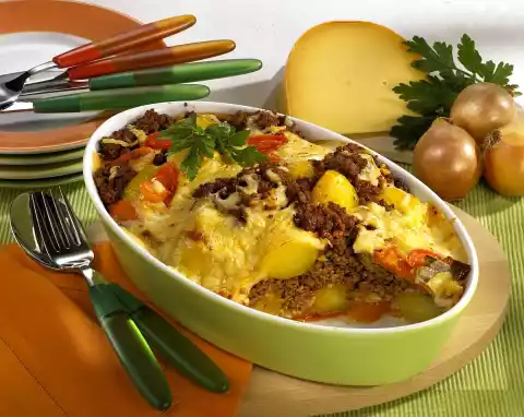 Season with salt, pepper and nutmeg. Grease an ovenproof dish (1.5 litre capacity). Spread the bottom with some béchamel sauce. Mix potatoes, carrots and minced meat and put half of it into the baking dish.