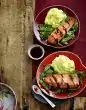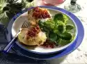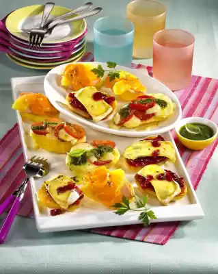 Halve potatoes lengthwise and alternately cover with tomatoes and mozzarella, camembert and cranberries or ham, pineapple and Chester cheese. Place on a baking tray lined with baking paper. Bake in a preheated oven (electric cooker: 200 °C/ convection oven: 175 °C/ gas: level 3) for approx. 10 minutes. Remove and arrange on a plate. Spread the pesto on the potatoes covered with tomato mozzarella. Serve garnished with parsley and basil