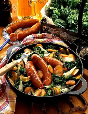 Heat the remaining fat in a large pan and fry the potato slices, turning them over. Season with salt and pepper. Season the kale to taste and add it to the potatoes.