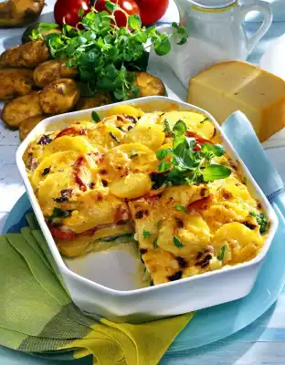 Place a layer of potatoes on top. Then a layer of spinach, potatoes, tomatoes and ham and again potatoes. Pour some sauce over each layer. Pour the rest of the sauce over it. Grate cheese finely and sprinkle over potato lasagne. Sprinkle with marjoram. Bake in the preheated oven (electric cooker: 200 °C/ gas: level 3) for 40 minutes