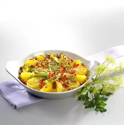 Season with salt, pepper and nutmeg. Peel potatoes and cut in half lengthwise. Fill potatoes and leek into a suitable casserole dish. Sprinkle with tomato and dill. Spread egg milk on top. Sprinkle with parmesan. Bake in the preheated oven (electric cooker: 225 °C/ convection oven: 200 °C/ gas: level 4) for about 12 minutes