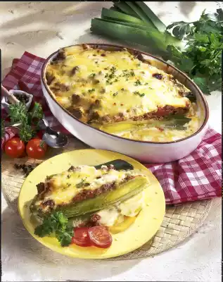 Place the potatoes in a large greased casserole dish. Pour 3/4 béchamel sauce over it. Place the leeks close together and cover with the chopped sauce. Pour the rest of the béchamel sauce over it and sprinkle with cheese. In a preheated oven (electric cooker: 200 °C/circulating air: 175 °C/gas: level 3) approx.