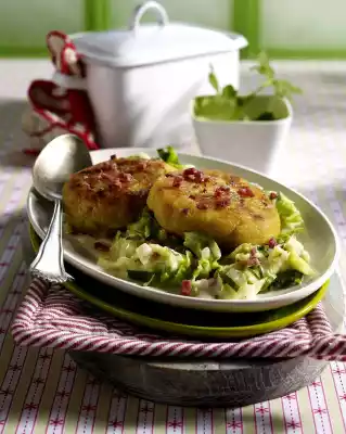 Wash the potatoes thoroughly and cook them in boiling water for about 20 minutes. Clean, quarter and wash the savoy cabbage. Cut out the stalk. Cut savoy cabbage into strips and blanch in boiling salted water for 1-2 minutes.