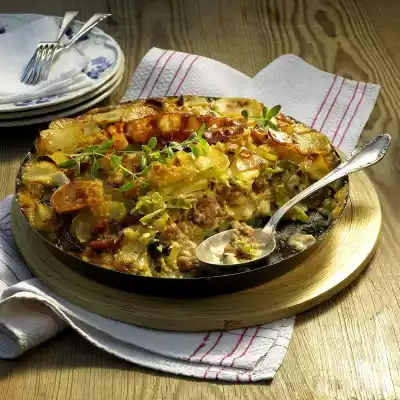 Peel, wash, thinly slice or slice the potatoes. Spread half in a greased ovenproof round dish (approx. 28 cm Ø). Add ground pork, savoy cabbage and the rest of the potatoes one after the other