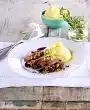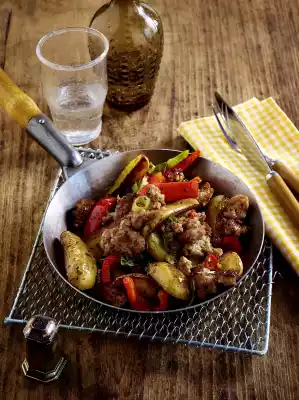 Remove the potatoes from the pan and keep warm. Fry the ground pork in the hot pan for about 10 minutes until very crumbly. After about 5 minutes add paprika, spring onions and chilli. Add potatoes to the pan, fold in and arrange.