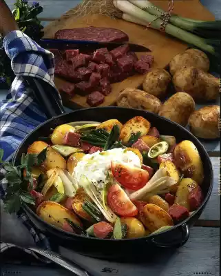 Cut the sausage into cubes. Drain the potatoes, rinse with cold water and peel off the skin. Halve potatoes lengthwise. Heat some clarified butter in a large pan, sauté spring onions and sausage briefly and remove. Put the rest of the clarified butter and the potatoes into the pan and fry until golden brown. Finally, add the spring onions and sausage and season with salt and pepper. Garnish with tomato and parsley and serve with Tsa-Tsiki