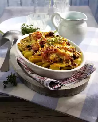 Season again with salt, pepper, sugar and paprika. Wash the thyme, shake dry, put a stalk aside for garnishing. Pluck the leaves from the stalks. Cut the potatoes into slices and place them in an ovenproof dish, raising the edge. Fill the chopped mushroom cream in the middle. Cover with slices of bacon, sprinkle with thyme leaves and cheese. Bake in the preheated oven (electric cooker: 175 °C/ convection oven: 150 °C/ gas: level 2) for about 30 minutes. Remove from the oven and garnish with thyme that has been put aside