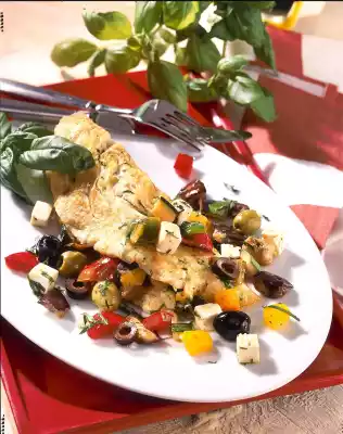 Arrange omelettes with antipasti on 2 plates and garnish with basil