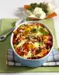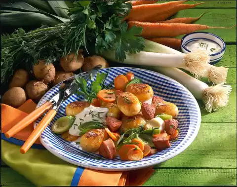 Fry potatoes in hot oil for about 5 minutes, season with salt and pepper. Add vegetables, fry for 10 minutes. Dice sausage and fry briefly. Season. Arrange everything