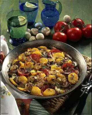 Add onions and mushrooms to the potatoes and fry for another 5 minutes. Wash, clean and halve the tomatoes. Mix eggs and milk. Season with salt, pepper and nutmeg. Sprinkle rosemary over the potatoes. Pour egg milk over them and let it simmer at low heat until the egg milk is firm