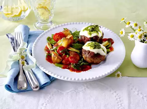 Add tomato sauce to the vegetables and heat briefly. Wash the remaining basil, shake dry and cut into fine strips. Take the meatballs out of the oven and add 1 tsp. pesto each. Arrange 2 meatballs and 2 tomato vegetables on plates.