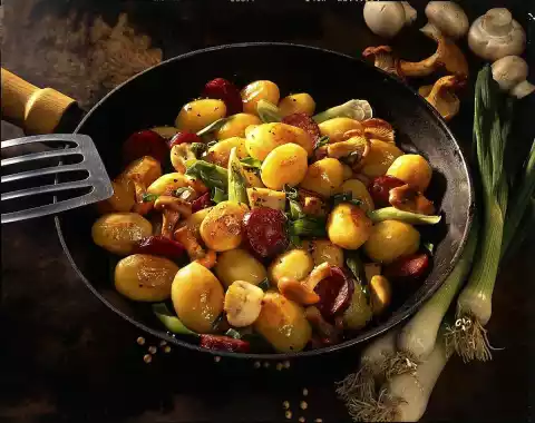 Peel and wash the potatoes. Fry in hot fat while turning for about 20 minutes. Clean, wash and chop the spring onions. Clean, wash and possibly chop the mushrooms. Cut sausage into slices. Add all ingredients to the potatoes approx. 5 minutes before the end of the cooking time and cook. Season with salt and pepper