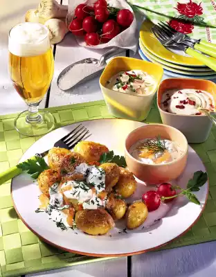Brush the potatoes vigorously under water. Heat the oil in a large pan. Fry the potatoes for about 30 minutes at medium heat, turning them frequently. Season with sea salt. Stir cream cheese, quark and mineral water until smooth.
