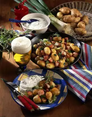 Wash the potatoes thoroughly and scrape off the skin. Heat the oil in a large pan. Fry the potatoes for 20 minutes at medium heat, turning them over. Cut the cured pork loin into cubes and add to the potatoes ten minutes before the end of the frying time.
