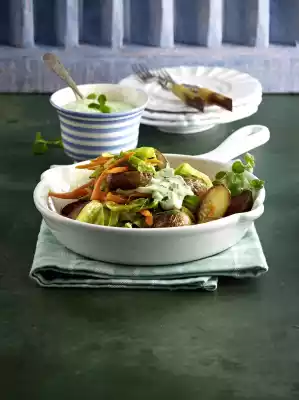 Drain the potatoes and fry them in 2 tablespoons of hot oil until golden brown all around. Add the vegetables again and season everything again with salt and pepper. Serve with the herb sauce. Garnish with remaining herbs.