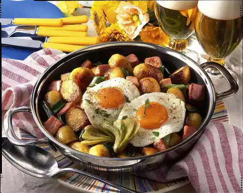 Fry the cured pork in it for about 10 minutes. After 5 minutes add the potatoes. Finally add spring onions and fry briefly. Season with salt and pepper. Keep the potato pan warm. Heat remaining oil in a pan, add eggs and fry over medium heat for 4-5 minutes.