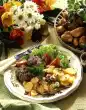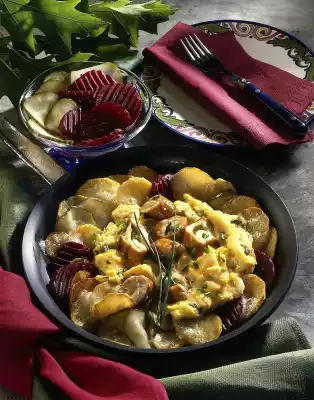 Season potatoes with salt and pepper. Add the remaining fat, pour the scrambled egg mixture over it and let it set at a mild heat. Use a spatula to gently push the mixture together. Add beetroot and cucumber slices to the potatoes.