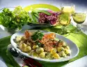 Peel, wash and slice the potatoes. Drain beetroot and cucumber. Heat half of the fat in a coated pan and fry the potatoes in it for about 10 minutes, turning them until golden brown.
