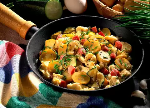 Heat the oil in a frying pan. Fry the potatoes for about 8 minutes while turning. Add garlic and zucchini, fry for 3-4 minutes and season