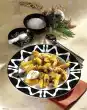 Season with salt and pepper. Take out some leek and put aside. Deglaze the rest with stock and cream and bring to the boil. Bind with sauce thickener and season again. Grate cheese finely. Put 3 potato pancakes on a baking tray covered with baking paper and spread about half of the mushroom ragout on top. Sprinkle with some cheese. Cover each with another potato pancake and spread the rest of the ragout on top. Sprinkle with cheese and put the remaining 3 potato pancakes on top as a lid.