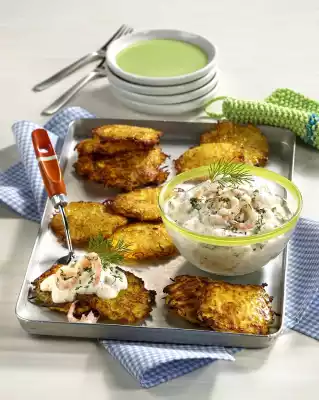 Mix potato pancake batter and egg. Line a baking tray with baking paper and brush with oil. Put 20 small potato piles on the baking tray and press them flat a little with a spoon. Bake in the preheated oven (electric cooker: 200 °C/ convection oven: 175 °C/ gas: level 3) for 20-25 minutes. Turn the potato pancakes halfway through. Mix the sour cream, mayonnaise and lemon juice.