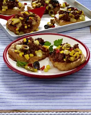 Heat 2 tablespoons of oil in a frying pan. Fry the minced meat until crumbly. Add onion and garlic, fry briefly. Add tomato paste, sweat briefly, add 100 ml water and braise everything briefly. Drain mozzarella and cut into cubes. fold corn mixture into the minced meat, season with salt, pepper and sugar