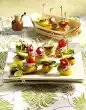 Cut pineapple rings into three. Cover the remaining buffers with 1 slice of ham, 2 pineapple thirds and the remaining cheese. Place the buffers on a baking tray and bake in a preheated oven (electric range: 200 °C/ gas: level 3) for approx. 10 minutes. Put 1 teaspoon of crème fraîche and dill on each salmon pancake. Garnish peach pancakes with fried onions and pineapple pancakes with cranberries