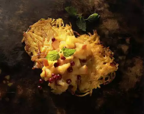 Mix with egg, flour and salt. Fry about 8 flat buffers in hot fat on both sides until golden brown. Arrange two buffers with compote on each side. Garnish as you like with lemon balm leaves