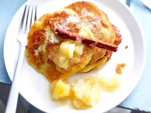 Arrange potato pancakes and applesauce on plates and garnish with cinnamon sticks.