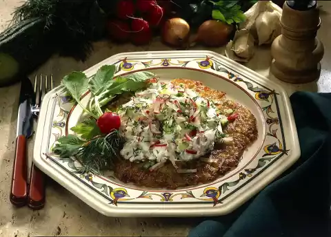 Fry the buffers on each side for 3-4 minutes. Place on a preheated plate. Fry 3 more buffers in succession. Spread the quark on the buffers and sprinkle with the remaining cut ingredients.