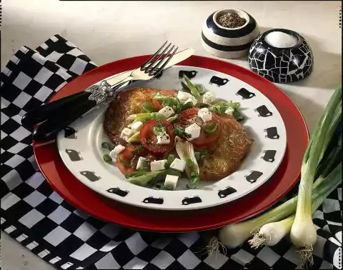 In the meantime clean, wash and chop the spring onions. Clean, wash and slice the tomatoes. Dice cheese. Heat the remaining oil in a frying pan, fry the spring onions for about 3 minutes, turning them and season with salt and pepper.
