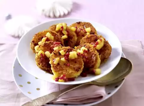 Put the pancreas crumbs on a deep plate. Knead the apple and ham mix with the dumpling dough. Form into a roll (approx. 5 cm Ø) with a little flour. Cut the potato roll into approx. 20 slices (each approx. 1 1⁄2 cm thick) and turn them into panko crumbs.